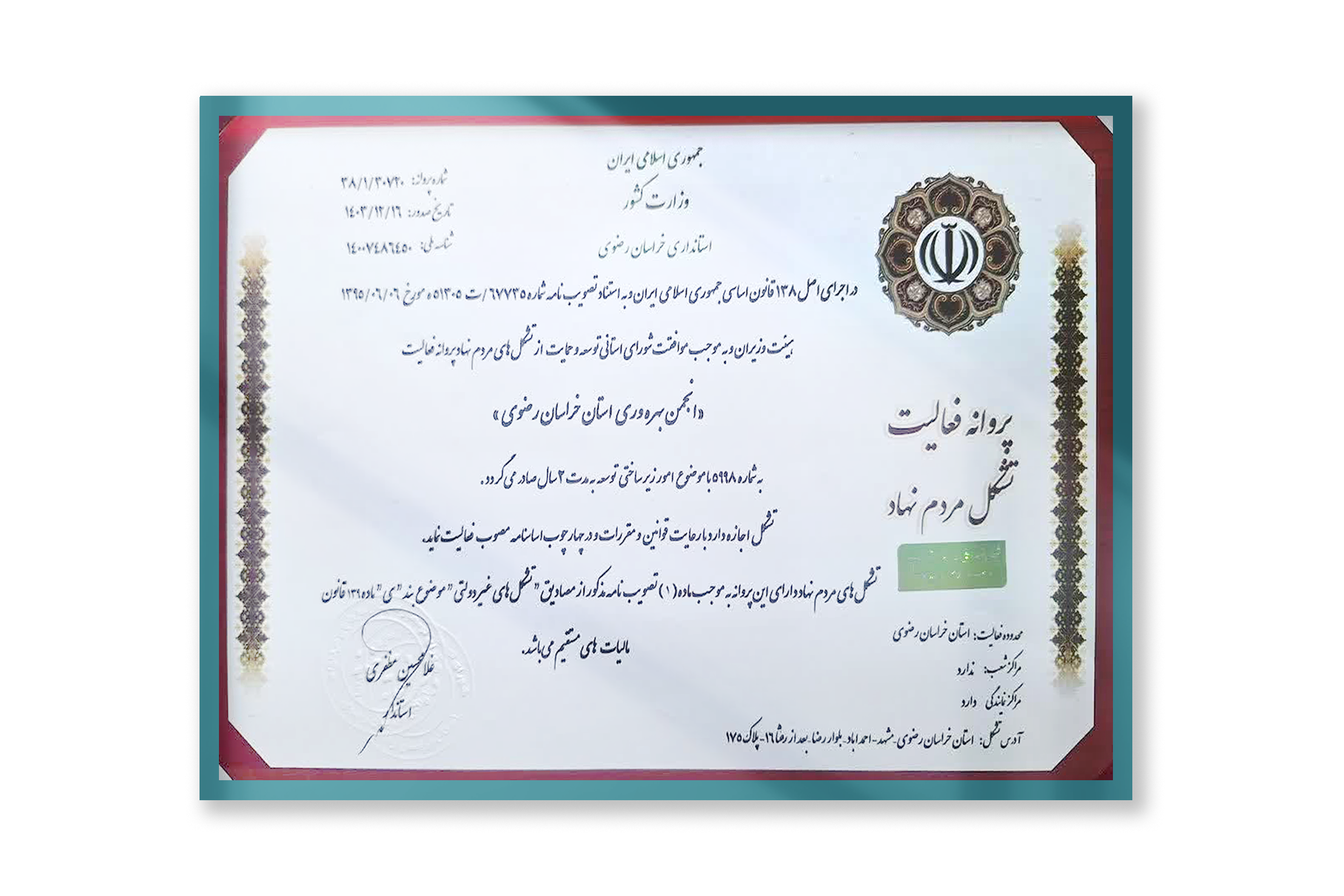 هیئت مدیره مکلف است نمونه سربرگ مهر و آرم تهیه شده را به استانداری خراسان معاونت امور اجتماعی اعلام نماید